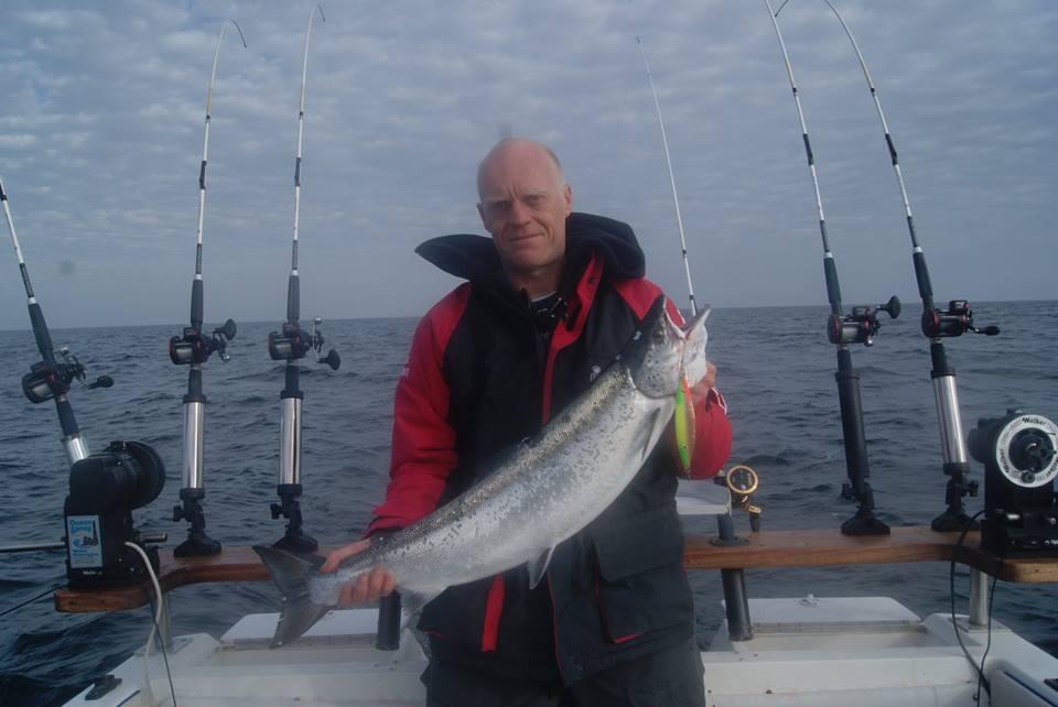 Der hvor jeg fiskede med downrigger blev der også bare sat en overflade stang så min opsætning blev, at jeg fiskede med 13 overflade stænger. Derefter gik der ikke længe før jeg fik et hug til på en Raptor i kobber med en grøn stimmel af tape – også med 30 gr bly foran. Det viste sig at være en 9,1 kg laks der ikke kunne stå for den. Resten af dagen blev det til 2 mistede fisk.