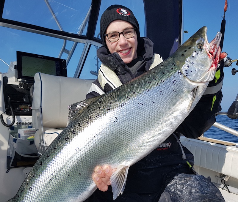 I lighed med de foregående dage var laksene i biddet – dog ikke så vildt som første dag. Blandt dagens fisk inhalerede en vilter laks et skrig gult blink fisket i overfladen, som et vogntog efter en lille gul dodger og belastet med 1,5 oz lod 30 fod foran.