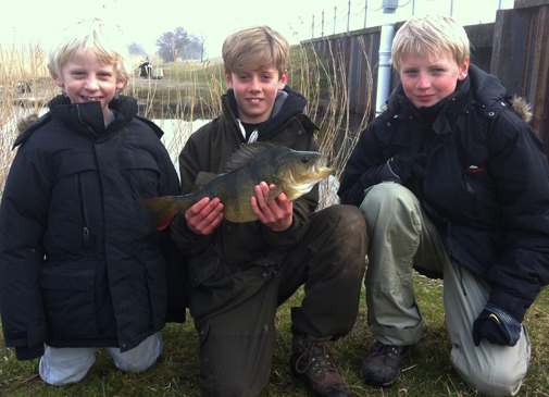 Kalle Sidal, i midten af billedet, fik denne aborre på 1,6 kilo på en Mepps i St. Vejleå.KALLE SIDAL var den 17. marts på fisketur på sin far, lillebror og hans bedste fiskeven, Jeppe, ved St. Vejle Å for at udfordre de sortstribede.